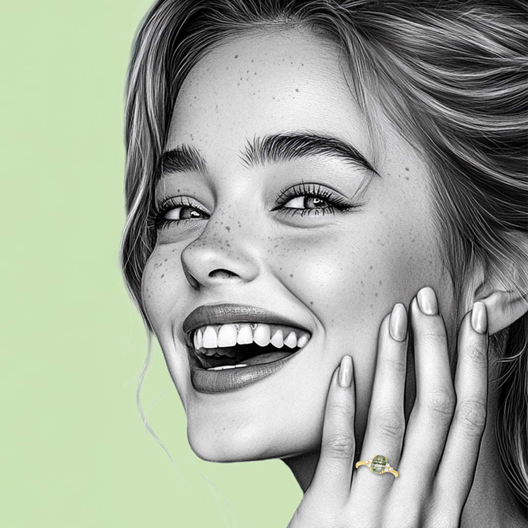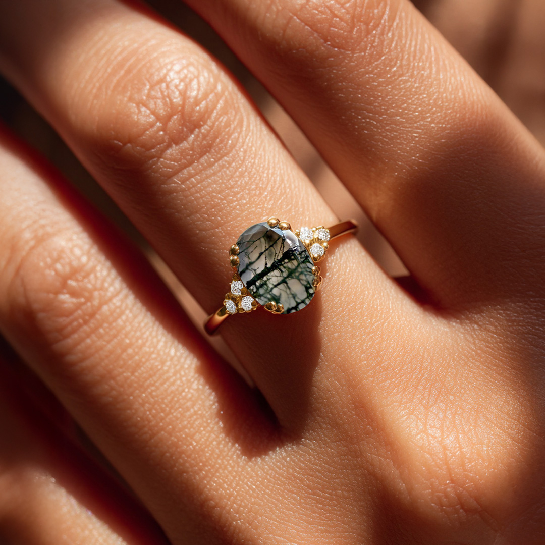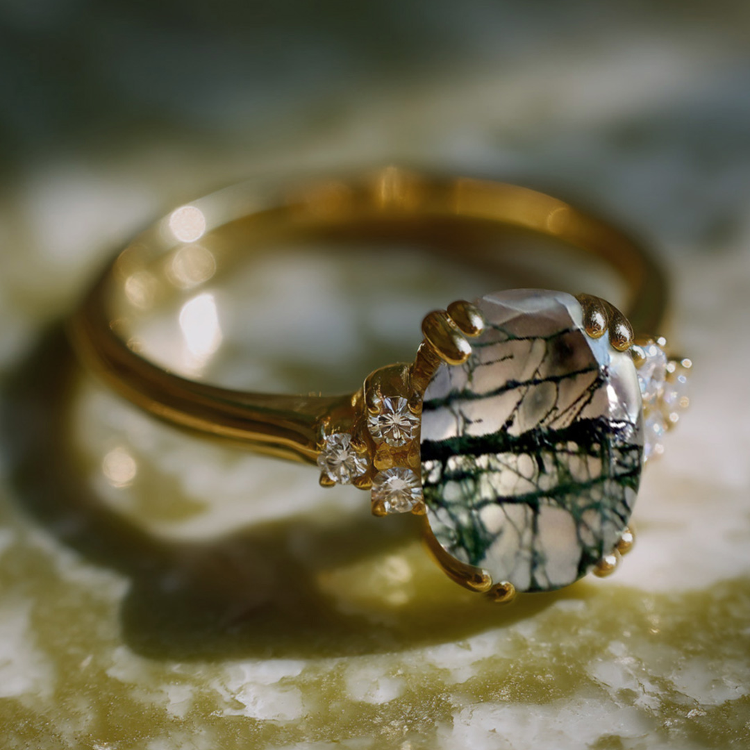Das Schöne daran, dass wir viele Verlobungsringe anfertigen ist (außer dem unbezahlbarem Romantik-Karma), dass wir extra dicht an den Trends der Zeit liegen. Die Jungen Damen sind ja so flott unterwegs bei TikTok und andere Platformen, dass ihre Verlobungsring-Wünsche uns gern mal in die Jetzt-Zeit katapultieren. Neulich besuchte uns ein junger Mann mit der Mitteilung, seine Zukünftige wünsche sich einen Ring mit Moosachat. Wie bitte ? Ich kannte diesen Stein bisher nur in Kugelform, zwischengesetzt zwischen lange Perlenketten, und das weit vor 1990.