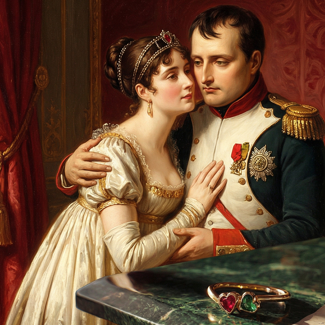 Wieso jetzt Toi et Moi ? Ringe mit zwei Edelsteinen, die sich umschmiegen und etwas berühren werden schon lange als Toi et Moi (auf Deutsch: Du und ich) Ringe bezeichnet. Die Geschichte geht wohl ursprünglich auf Napoleon Bonaparte zurück der seiner geliebten Joséphine de Beauharnais mit einem Ring bestehend aus einem tropfenförmigen Diamanten und einem passenden Saphir einen Heiratsantrag machte. Die romantische Symbolik von zwei unterschiedlichen Edelsteinen, die sich aneinander lehnen oder umarmen, hat bald die Herzen der Menschen erobert. Im Lauf der Zeit wurde viele verschiedene Edelsteinformen zu Toi et Moi Ringen verarbeitet, mal zart und verspielt, mal groß und bombastisch. Im Verlobungsring von Jackie Kennedy zu Beispiel wurden ein riesiger eckiger Diamant und ein eckiger Smaragd plus massig weitere Diamanten zusammengestapelt. Meine Meinung: Wenn der Toi et Moi Ring die innige Verbindung von zwei Menschen symbolisiert, dann sind zwei Steine eine wunderschöne romantische Sache. Wenn man auf einem Verlobungs-Toi et Moi noch die ganze Party plus Publikum unterbringt, najaaa, Geschmäcker sind verschieden. Da lobe ich mir den napoleonischen Ring, bei den Abbildungen finden Sie eine Skizze dieses äußerst kostbaren Ringes.